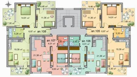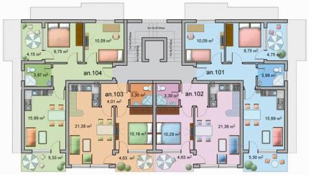 Здание 5: состоит состоит из 16 апартаментов-8 трехкомнатных, 6 двухкомнатных и 2 однокомнатных, 1 паркинг место и 5 гаражей для собственников автомобилей.